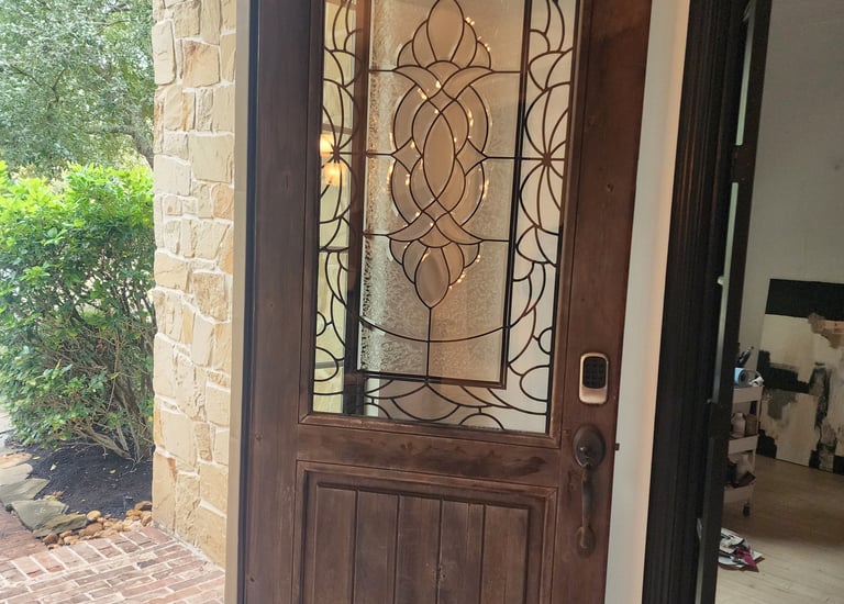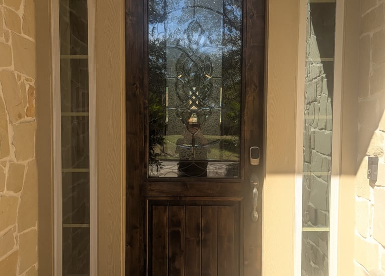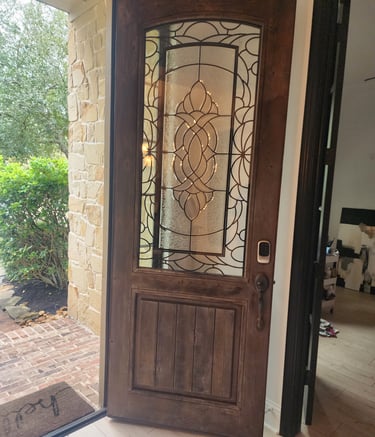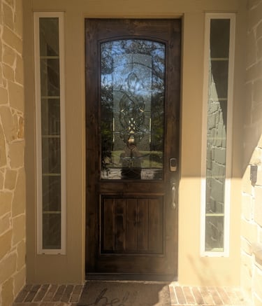 Vibrant red stain on a classic wooden front door.
